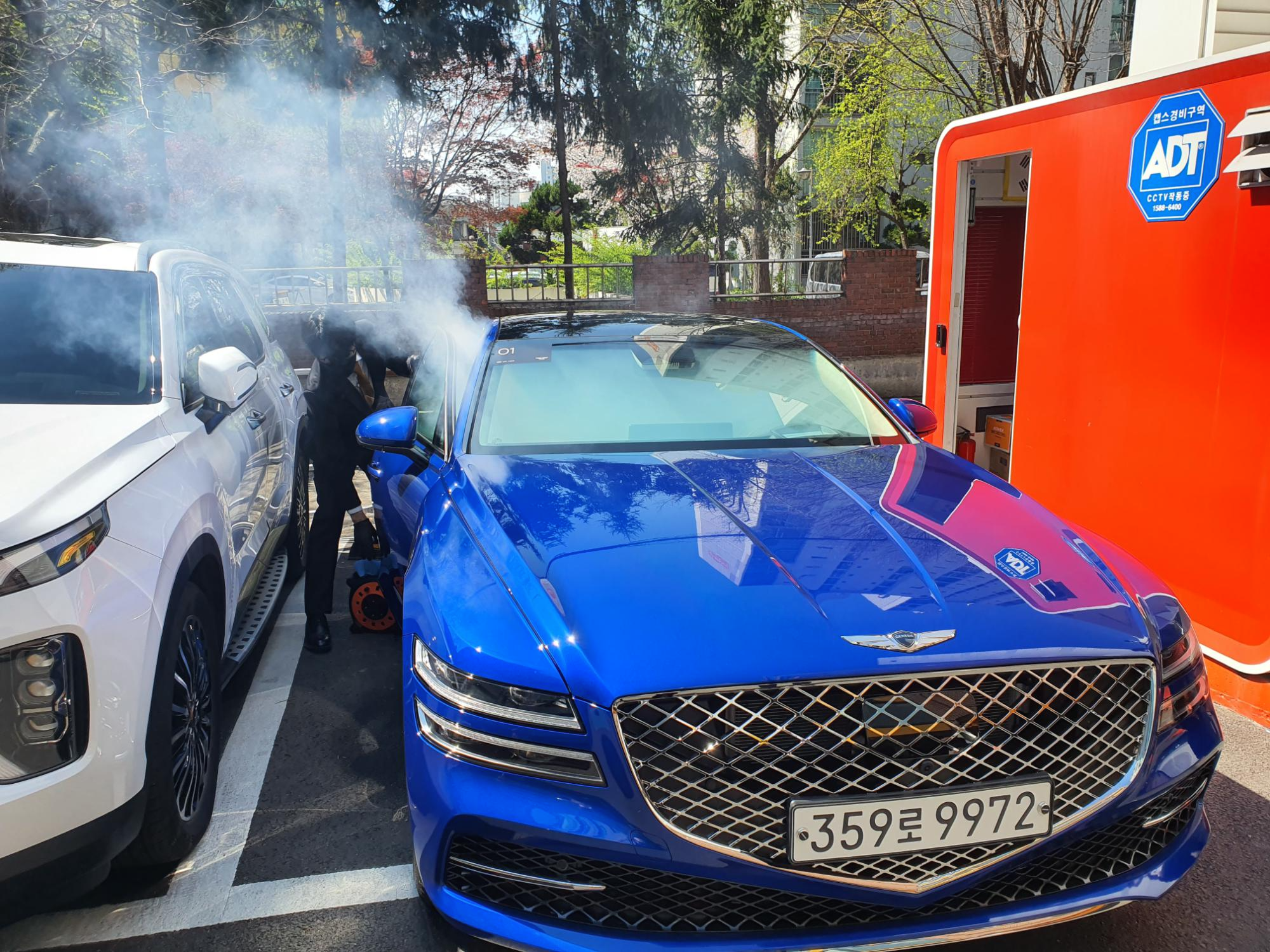 방역물품 설치 뿐만 아니라 방역기로 차량 한 대 한 대, 신경쓰며 소독했죠!