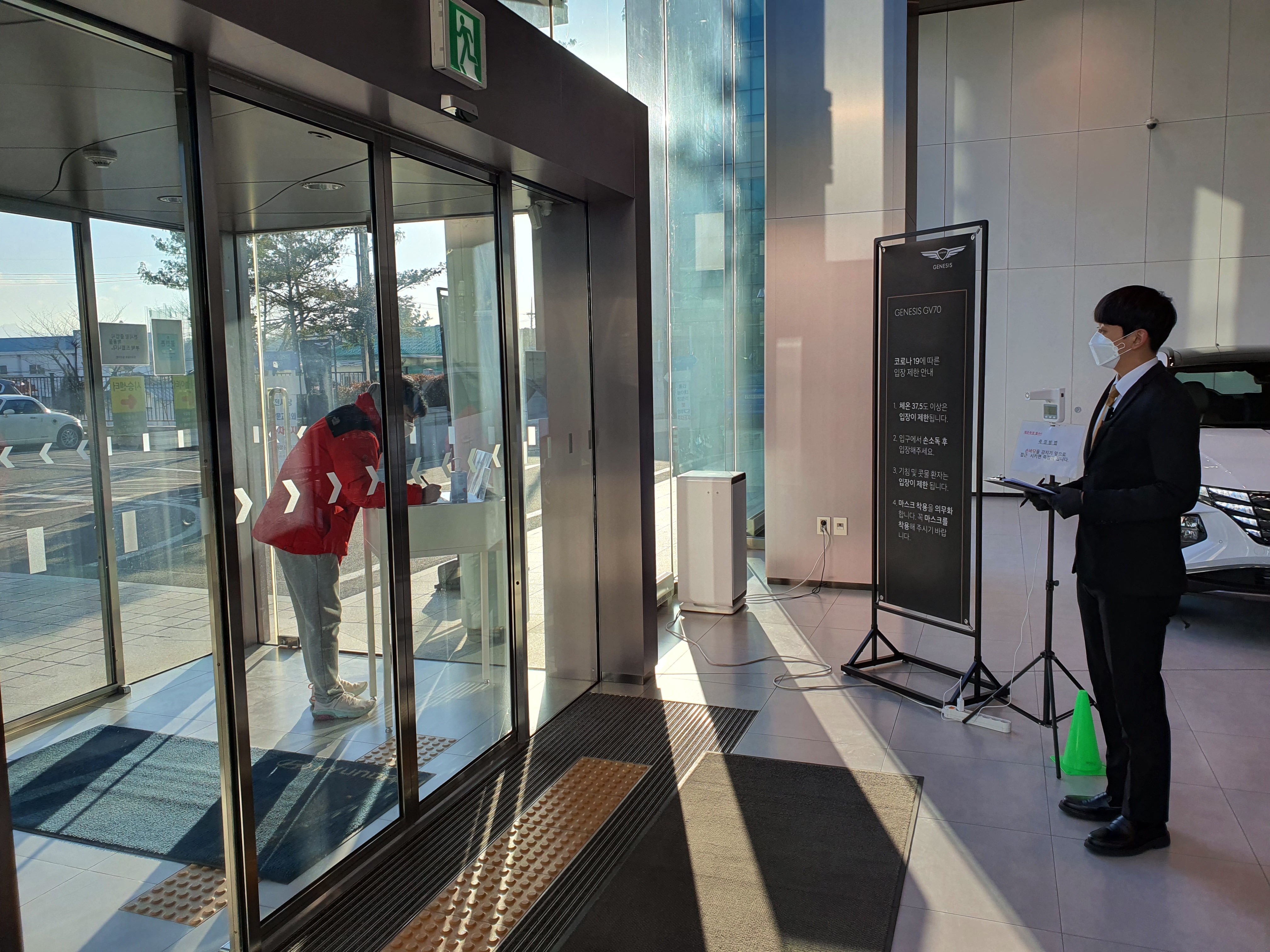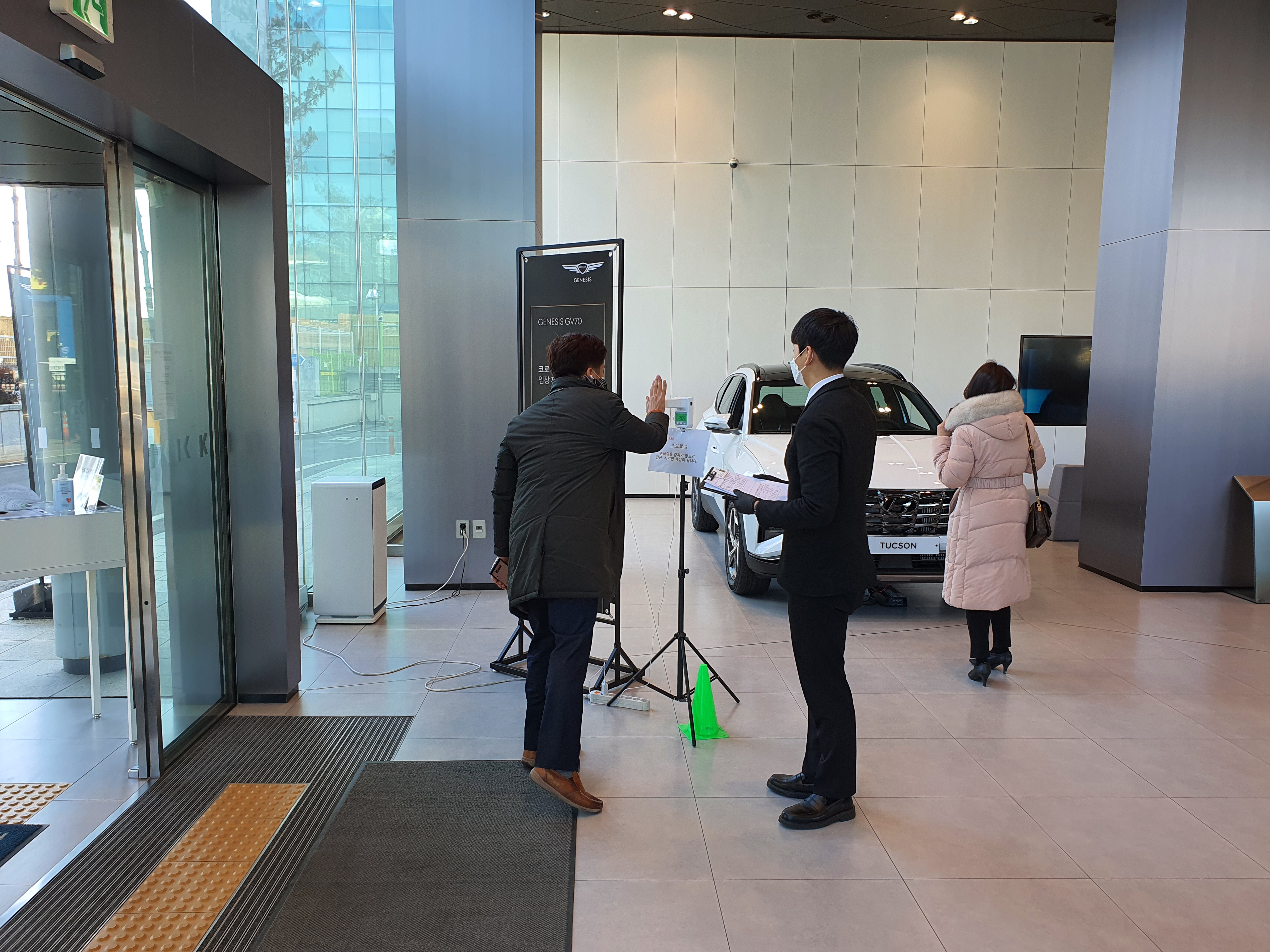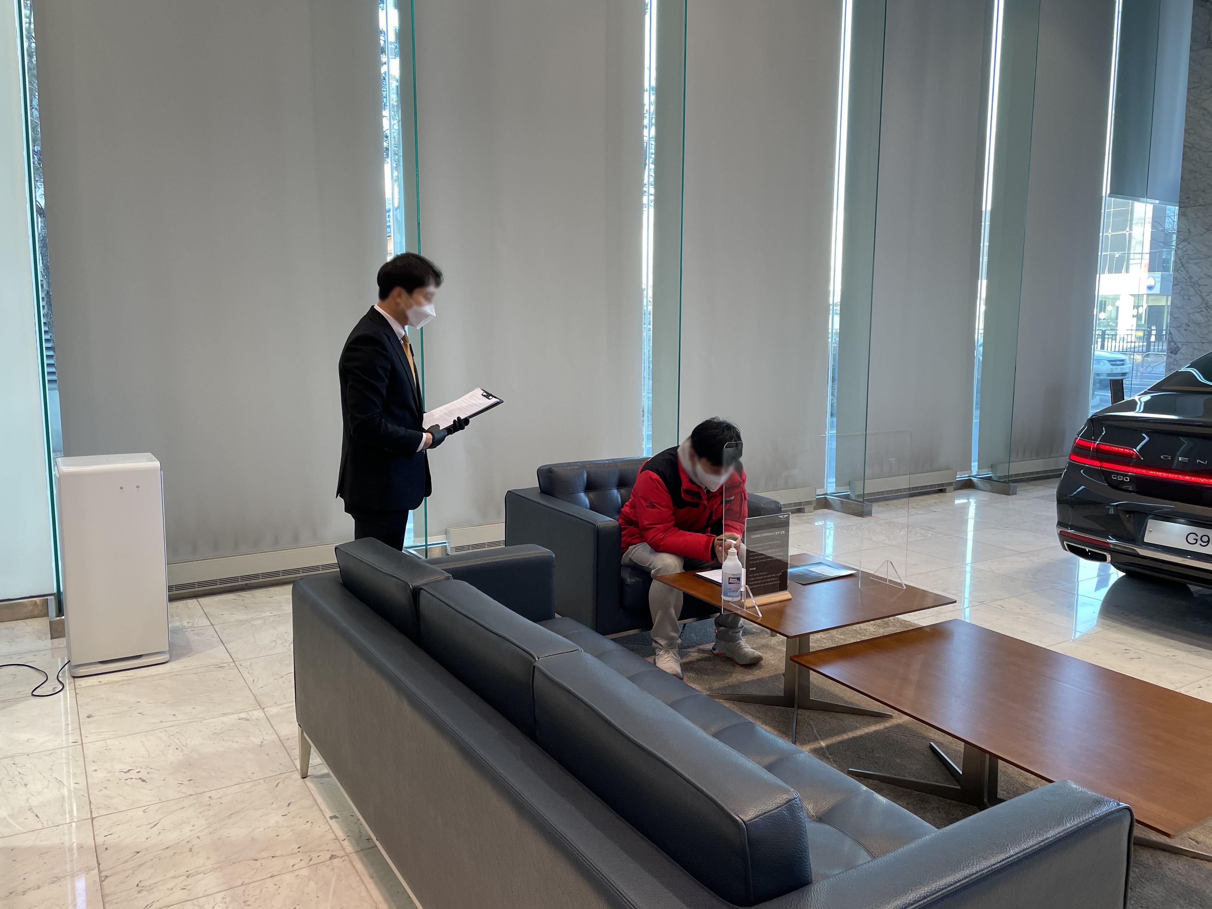 행사장 정문에 들어오기 전, 문진표를 작성하고 들어와서 열 측정기에 손바닥을 대고 열 측정 후, 이상이 없으면제네시스 프라이빗룸으로 안내합니다. 코로나 19 대응 단계 격상으로 인해 초청되신 고객분들의 우려를 감안하여 최대한의 안전 거리를 유지하고 프라이빗한 공간을 제공하고자 사용한 공간입니다!