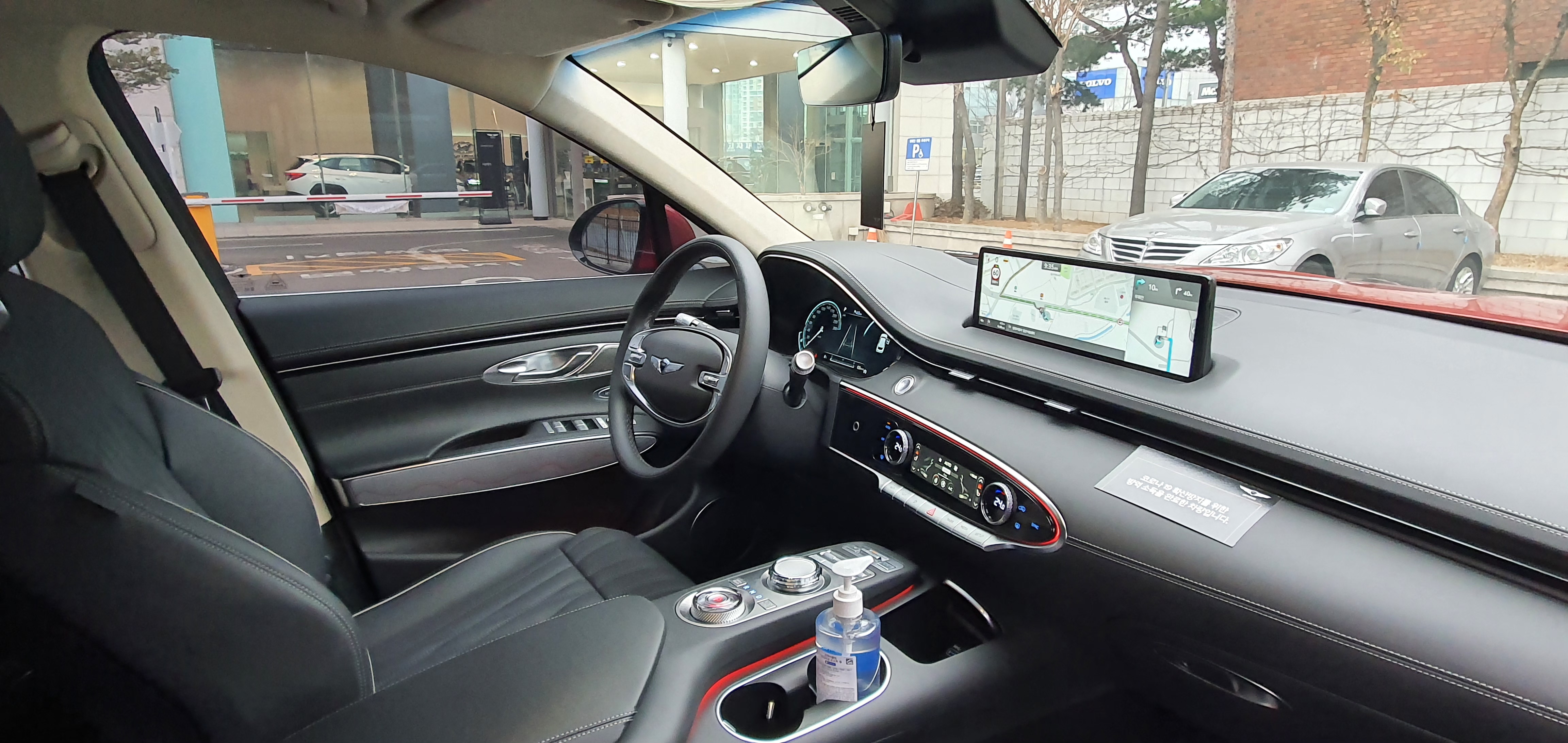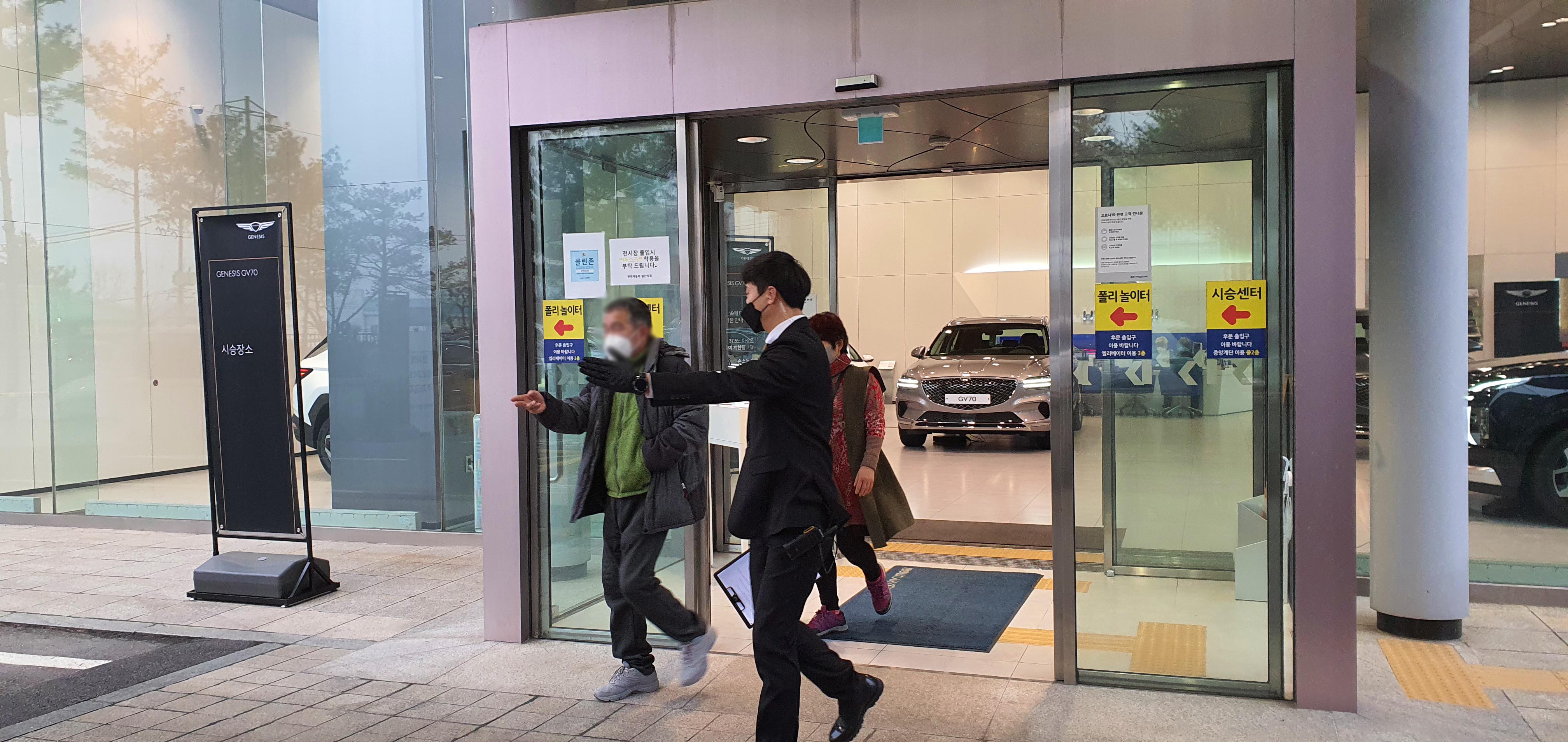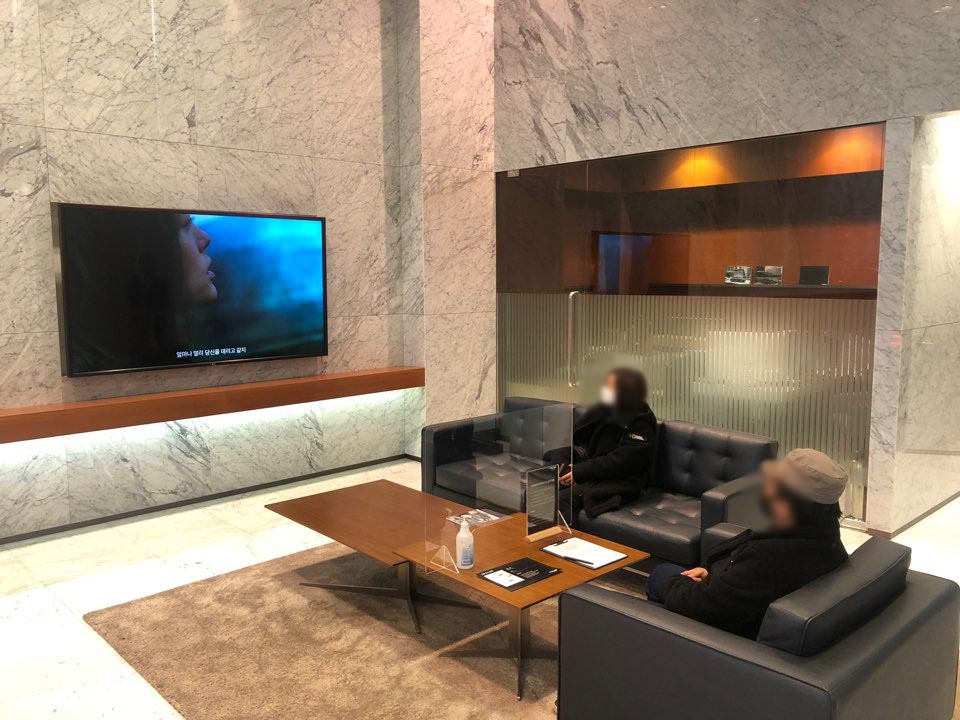 행사장 정문에 들어오기 전, 문진표를 작성하고 들어와서 열 측정기에 손바닥을 대고 열 측정 후, 이상이 없으면제네시스 프라이빗룸으로 안내합니다. 코로나 19 대응 단계 격상으로 인해 초청되신 고객분들의 우려를 감안하여 최대한의 안전 거리를 유지하고 프라이빗한 공간을 제공하고자 사용한 공간입니다!
