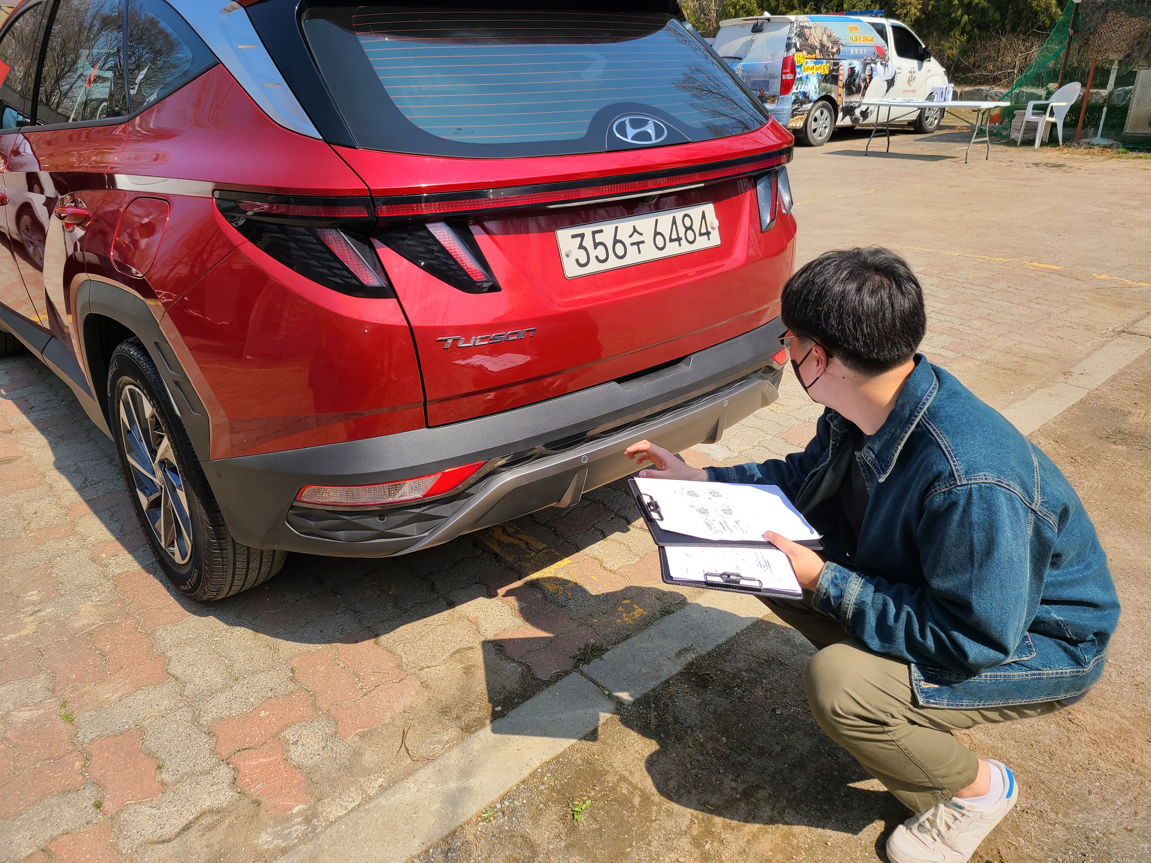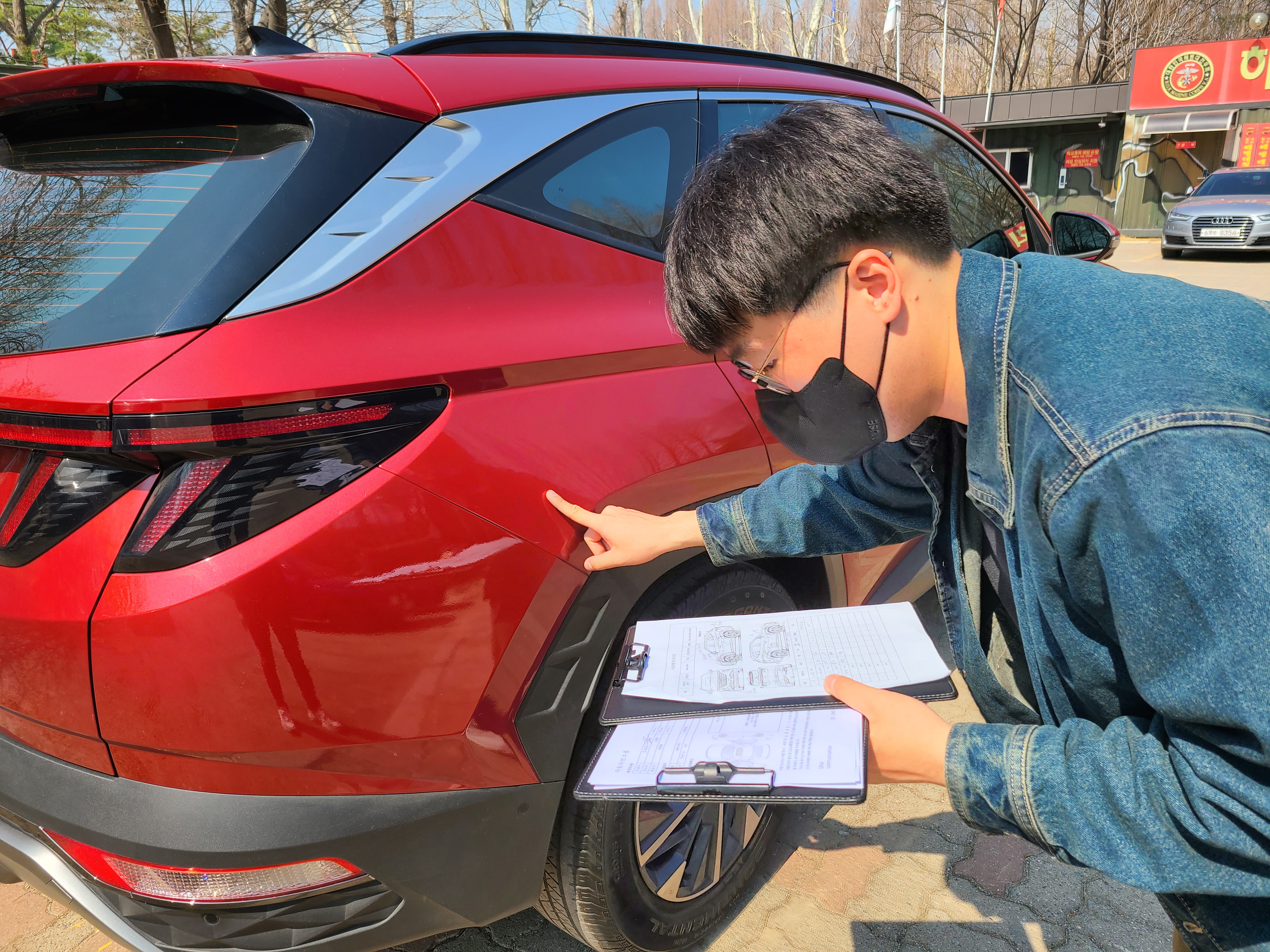 꼼꼼한 차량 외관 검수를 위해 저희 직원이 눈에 불을 켜고 차량을 확인하는 모습이랍니다 : )
