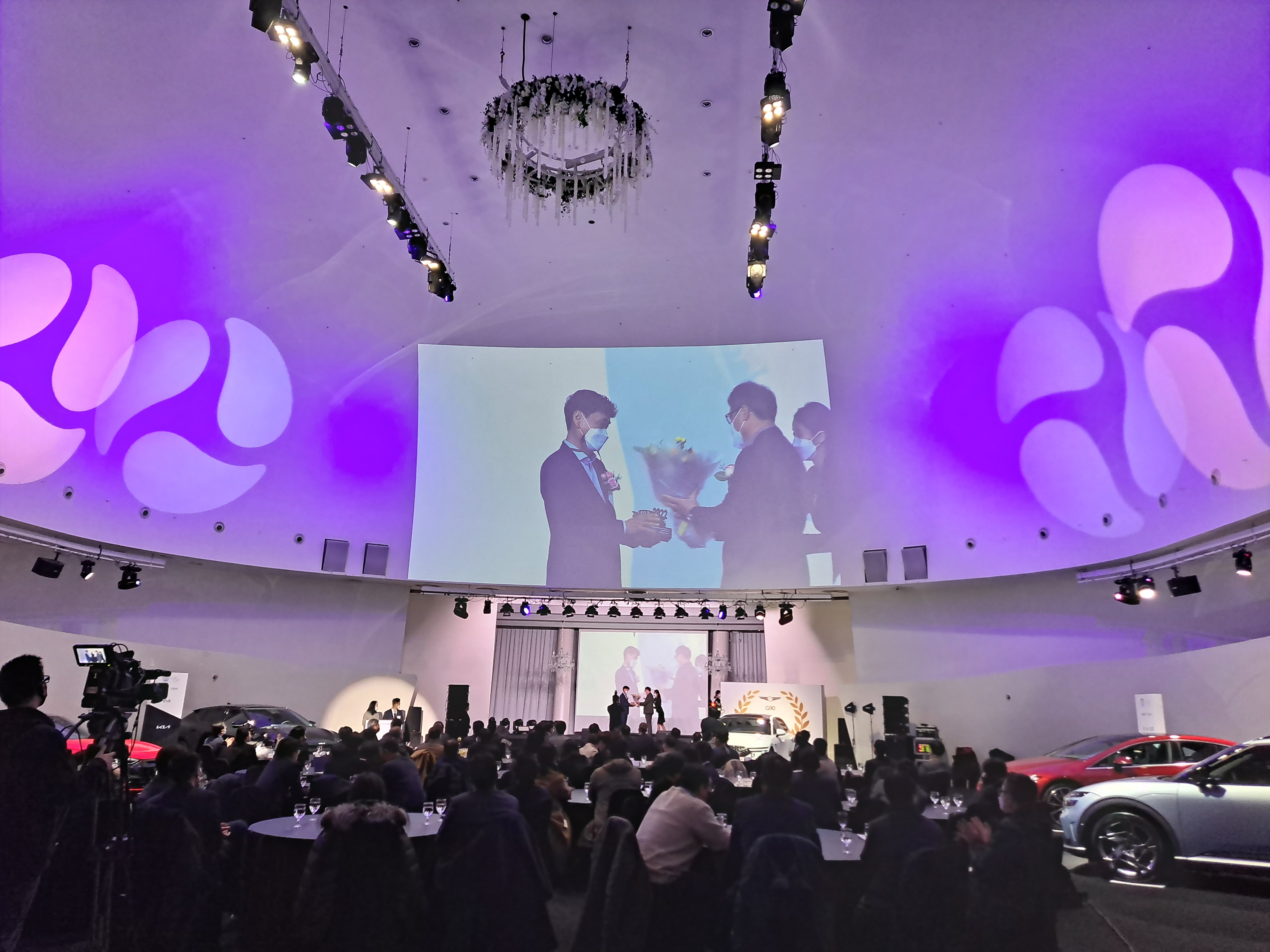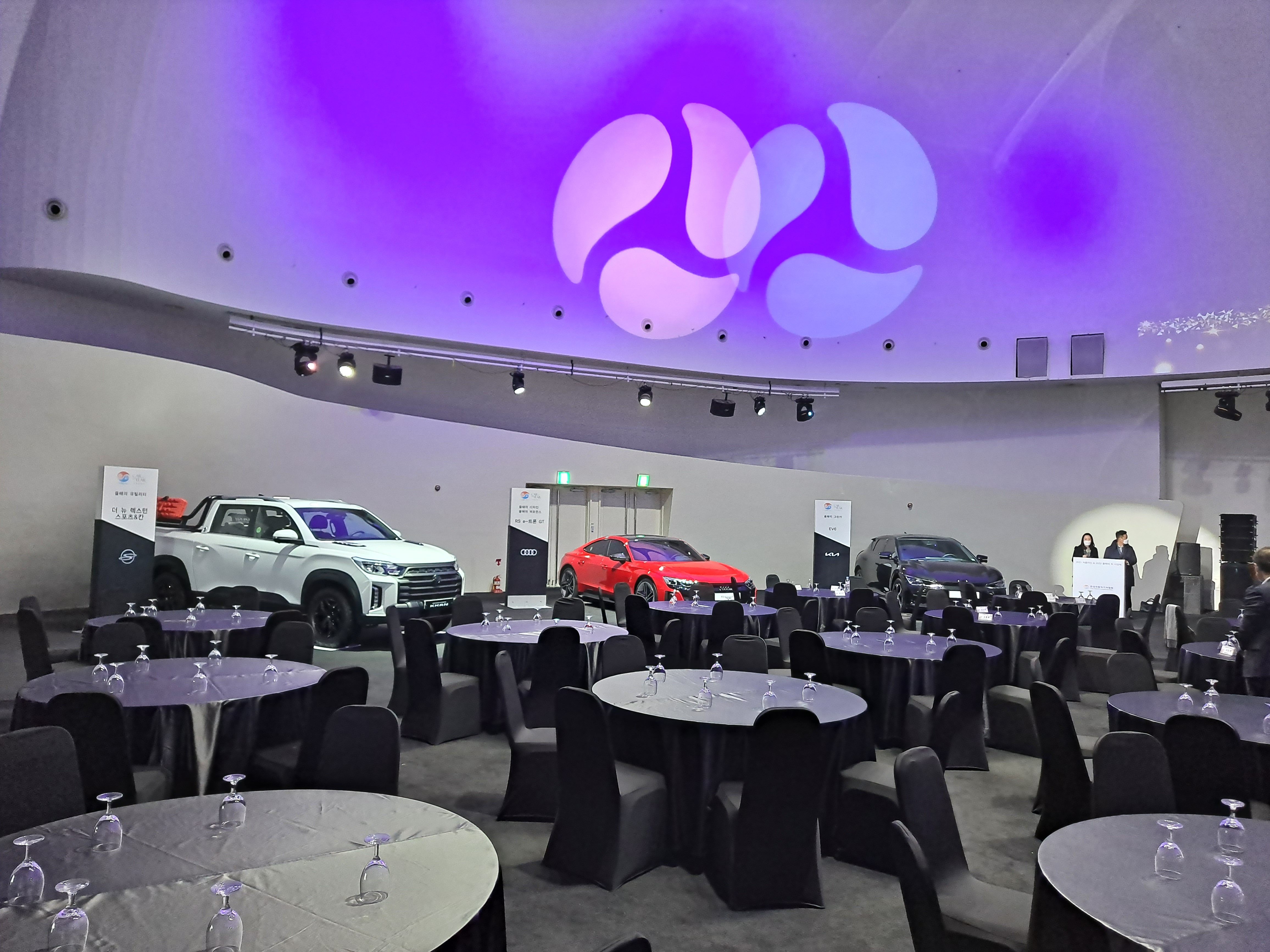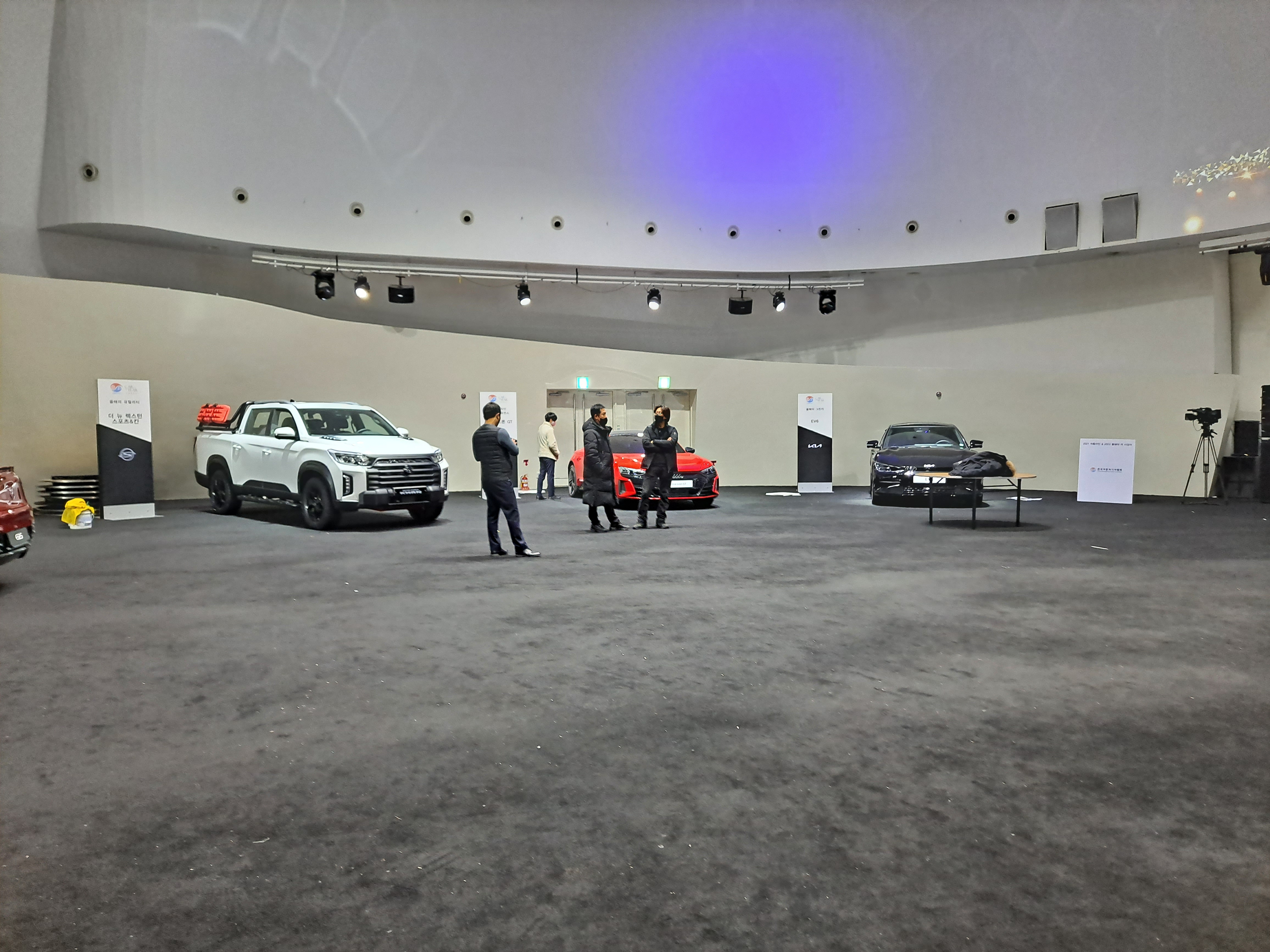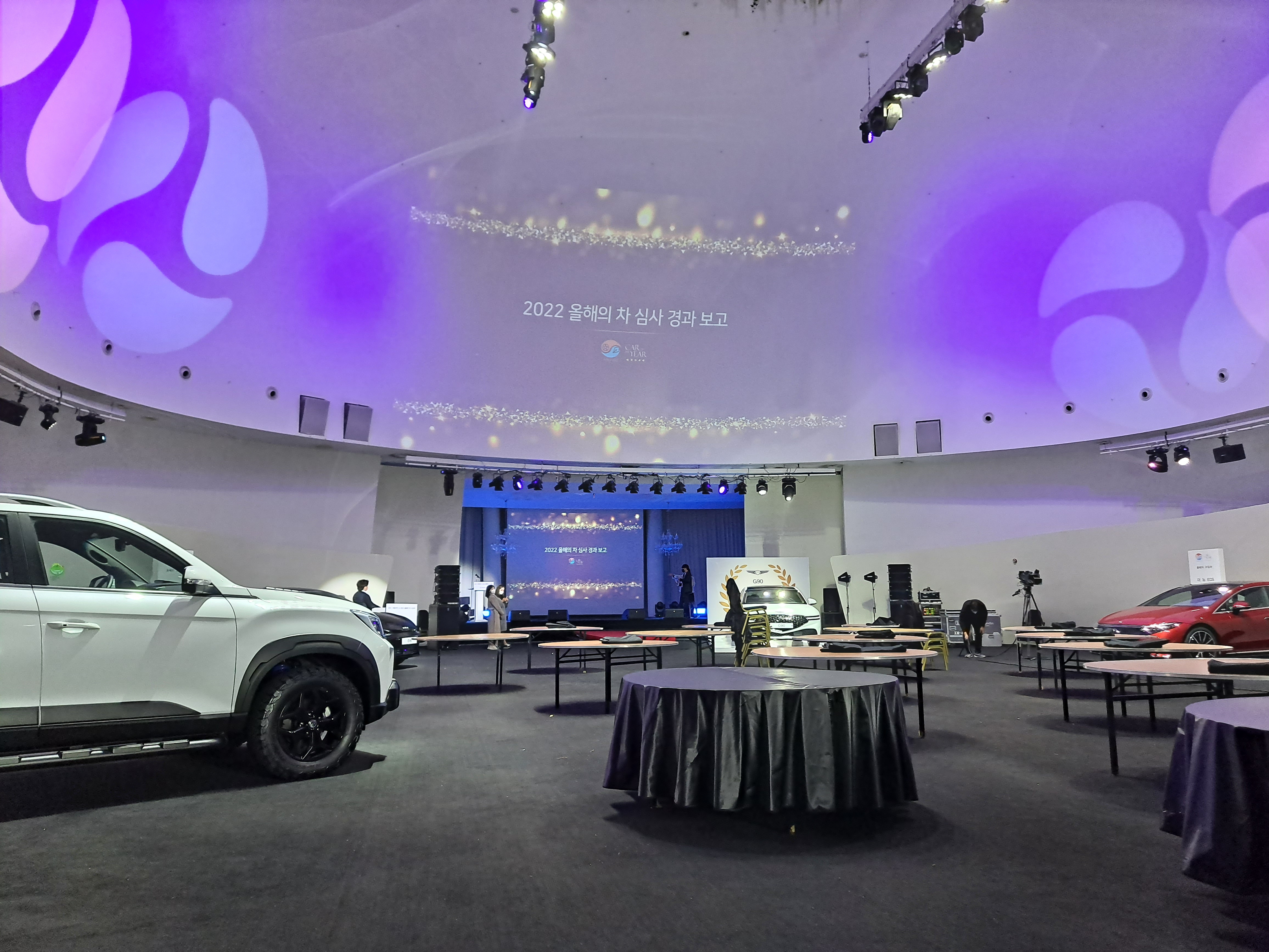 휑한 컨벤션 홀을 차량과 함께하는 멋진 시상식 현장으로 꾸미기 위해 움직이는 모습입니다
